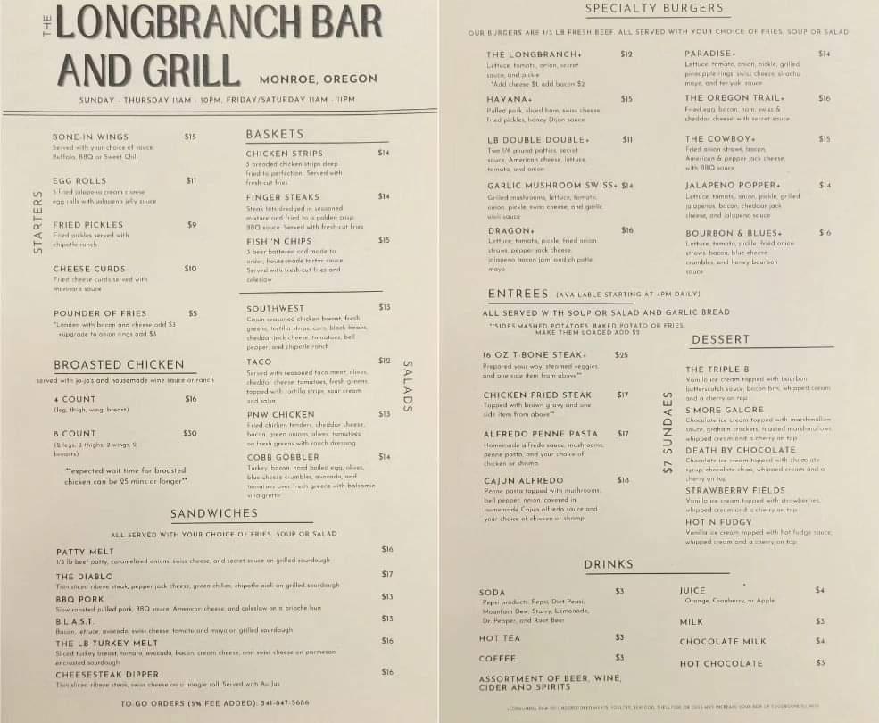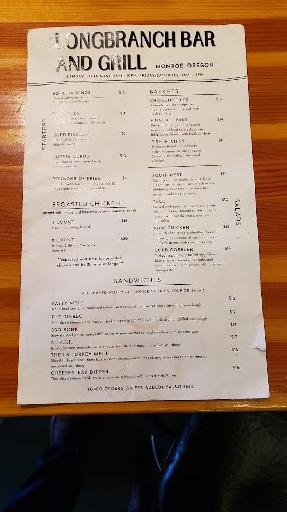 Welcome to Longbranch Bar & Grill, your go-to destination in Monroe, OR, for a delightful dining experience! Located at 270 S 5th St, we offer a cozy atmosphere perfect for enjoying breakfast, lunch, or dinner, whether you're solo or with friends. Indulge in our extensive menu featuring delicious local specialties, refreshing cocktails, and a wide selection of beers. Join us for our lively quiz nights or catch your favorite sports events while savoring our happy hour deals. With wheelchair accessibility and outdoor seating, we ensure everyone can enjoy our relaxed ambiance. Come for the food, stay for the fun!